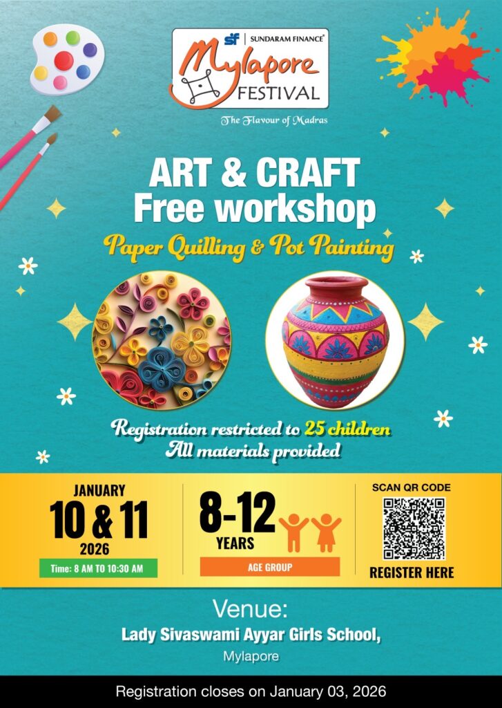 The Art & Craft Workshop for Children on Paper Quilling will be held on Saturday, January 10th, 2026 at Lady Sivaswamy Ayyar Girls School Mylapore, between 8 am to 10 am. The workshop on Pot painting will be held on Sunday, January 11, 2026 at Lady Sivaswamy Ayyar Girls School, from 8 am to 10 am.
